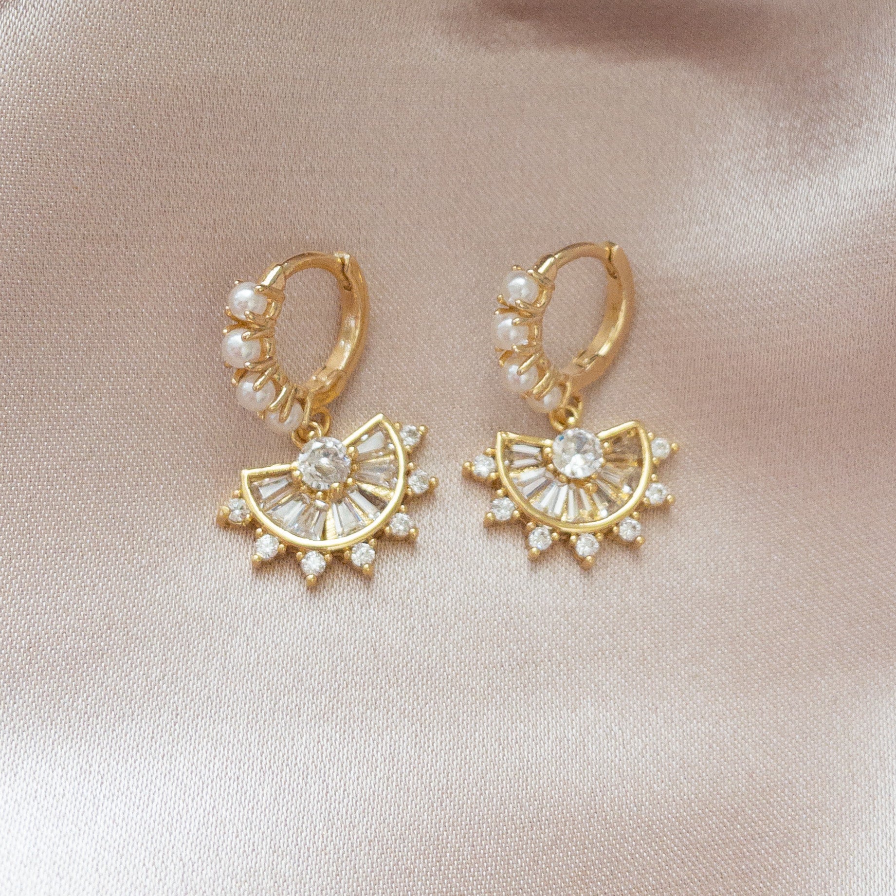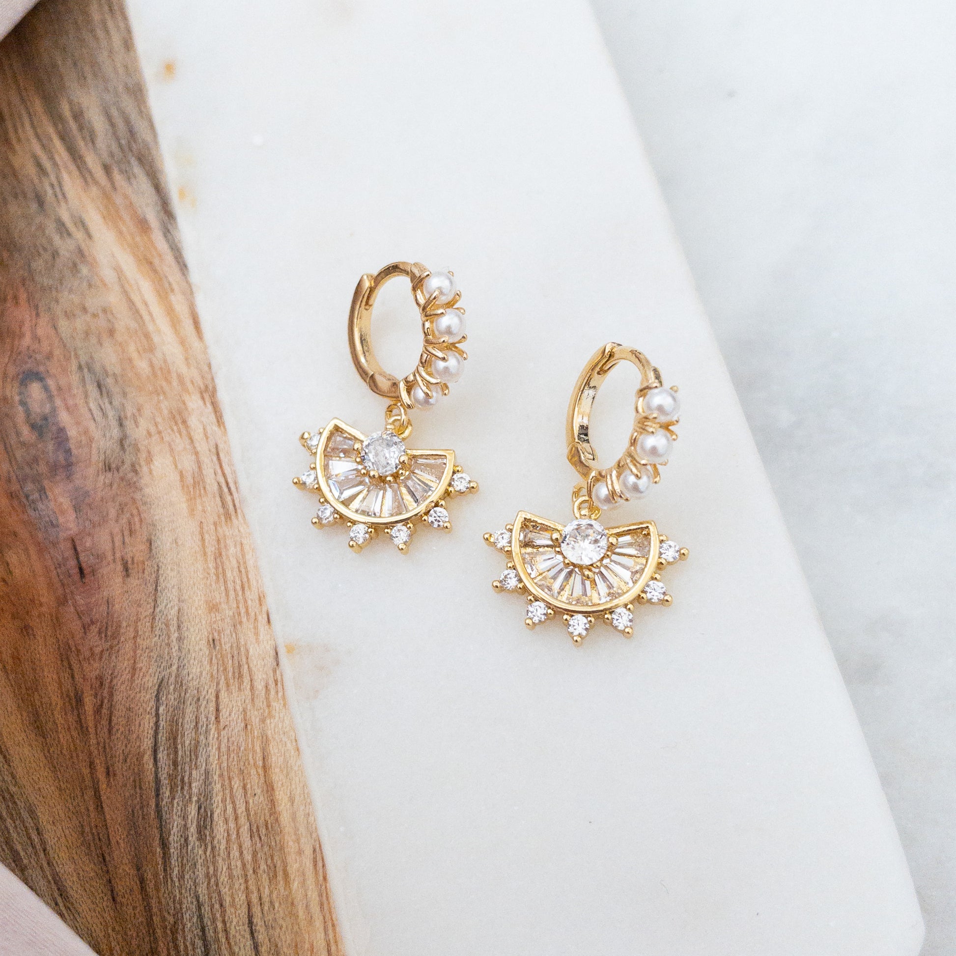 The sweetest earrings, featuring small faux pearl huggies and the Amelia crystal fan charm.