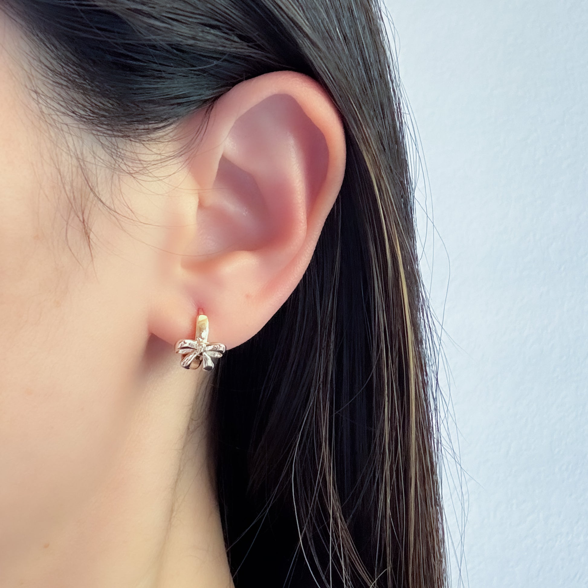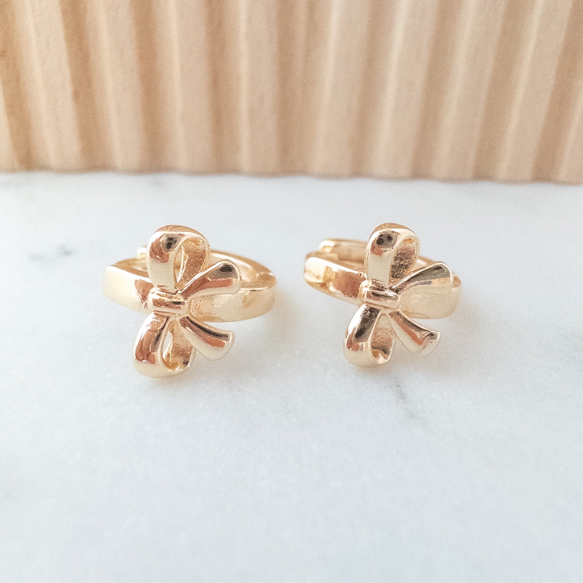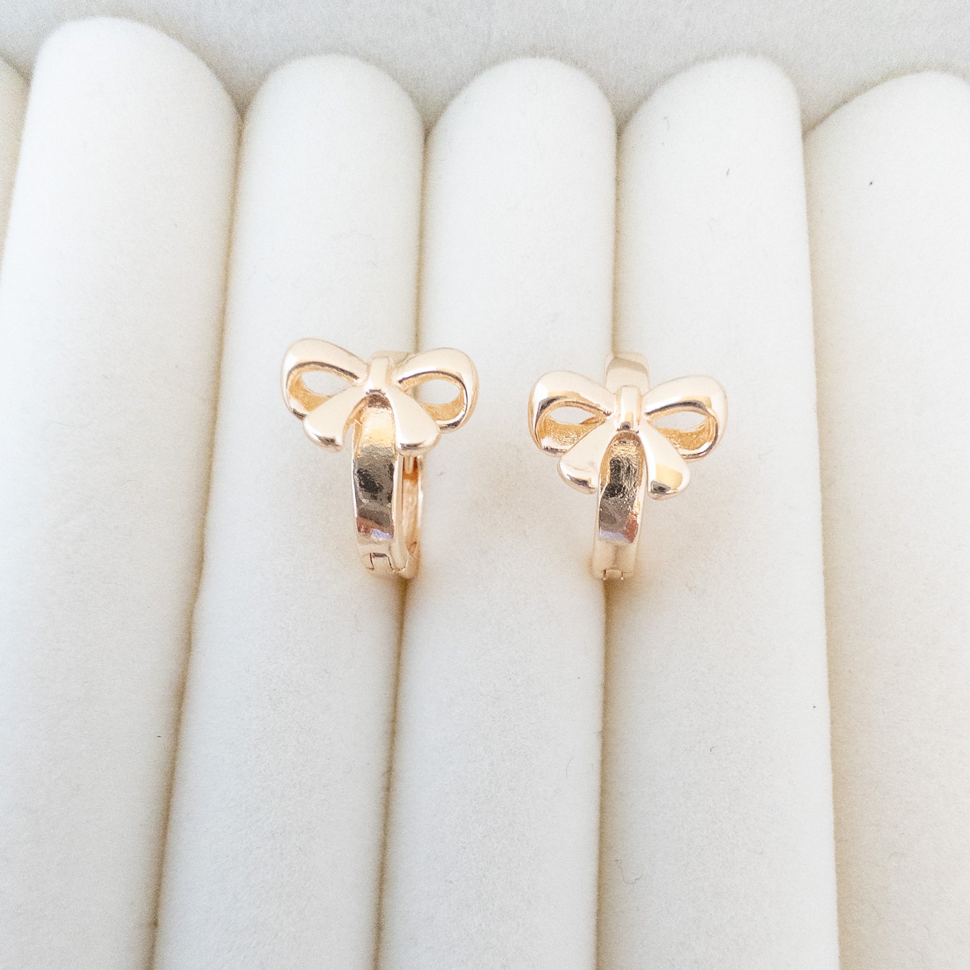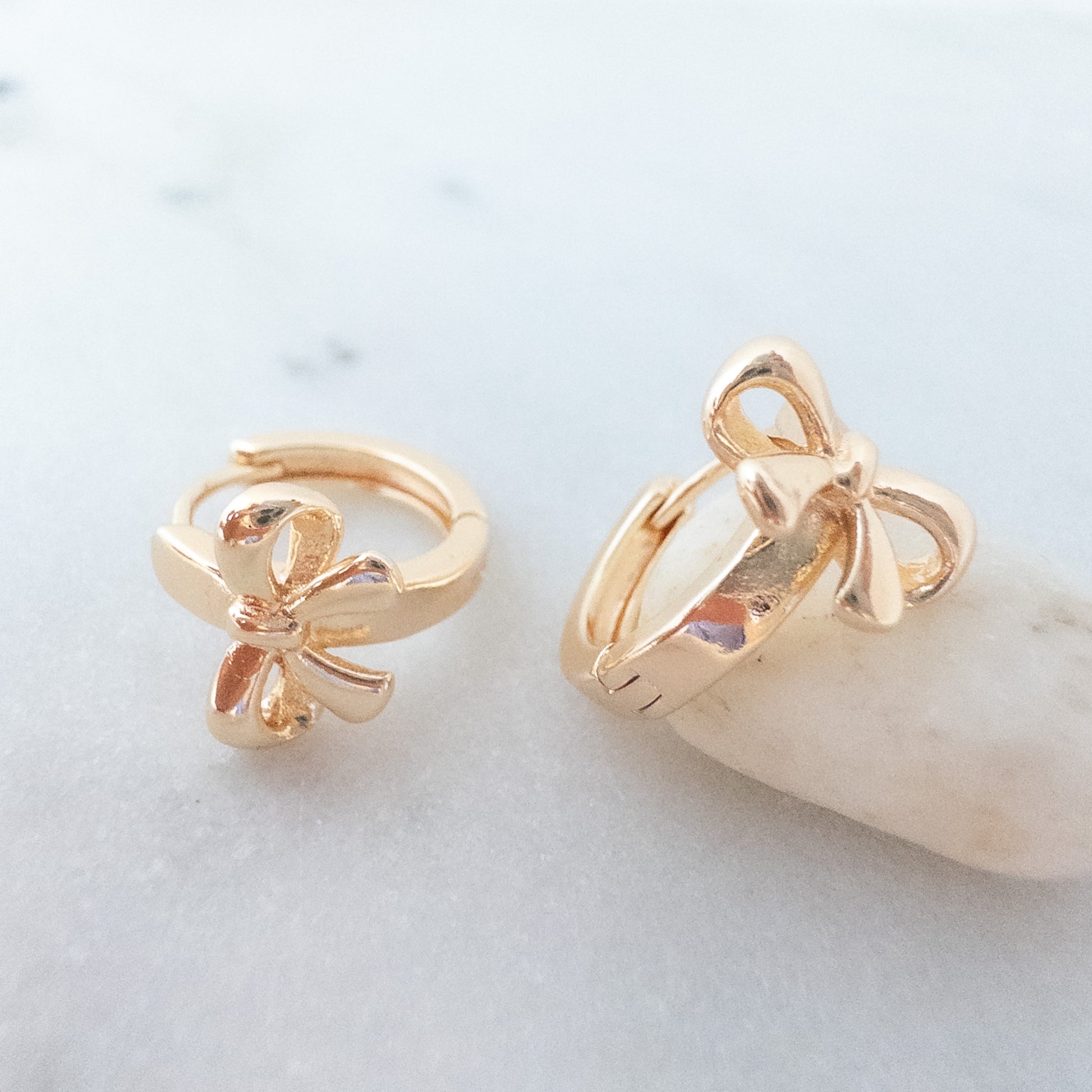 Small gold hoop earrings featuring an adorable tiny bows.Β Complete your feminine look with these dainty little treasures.
