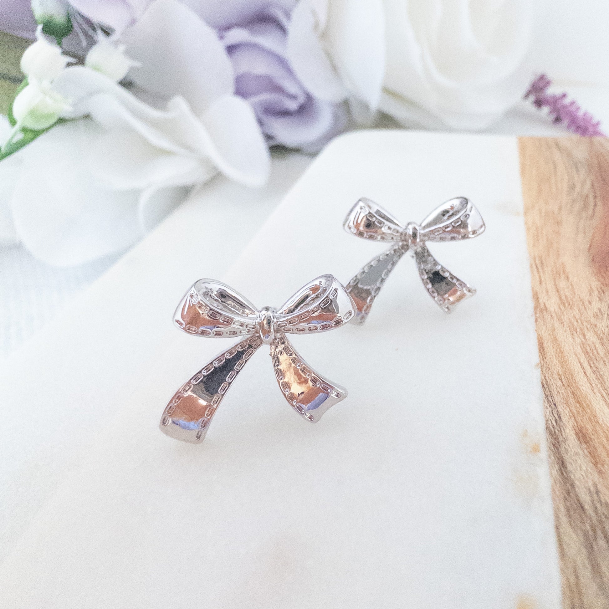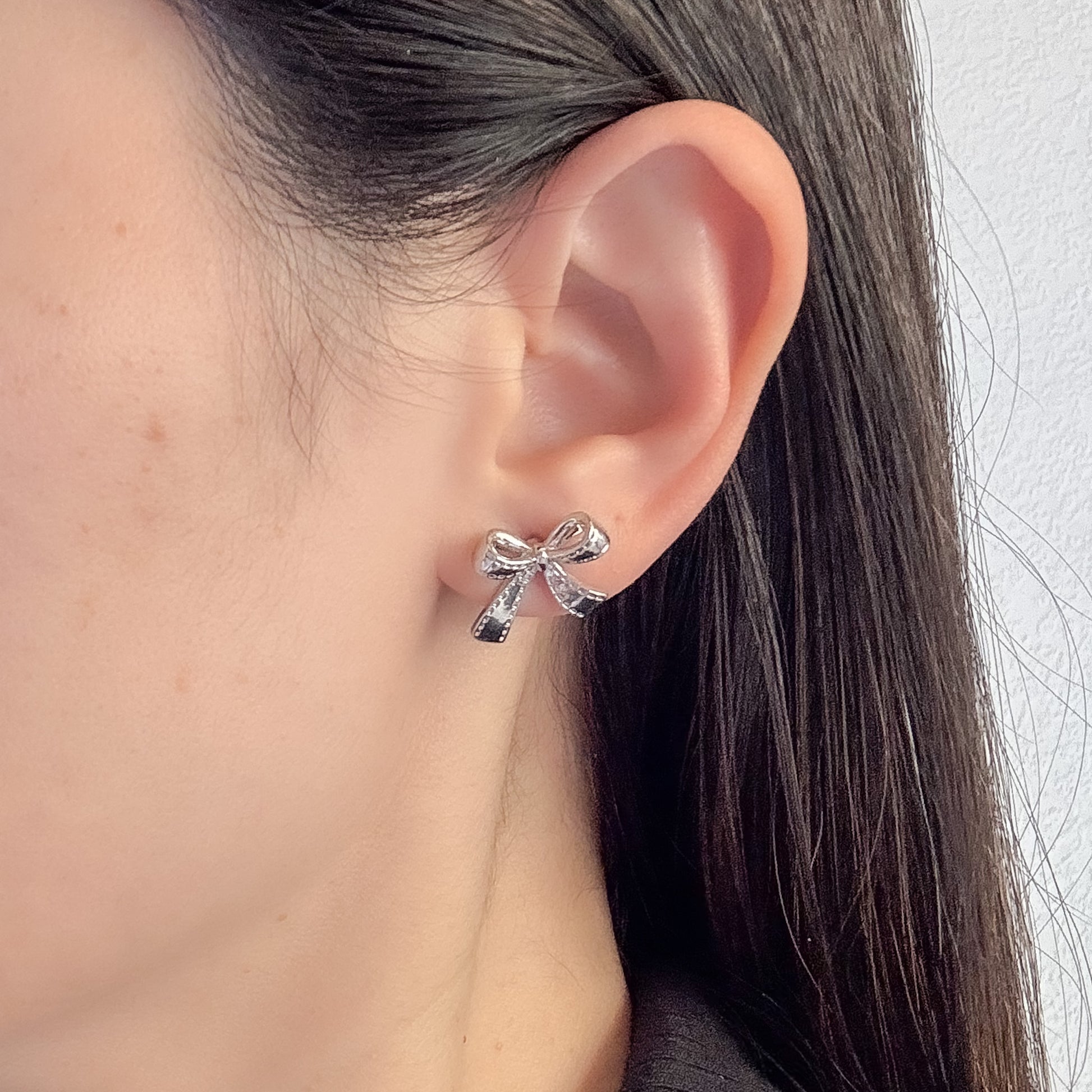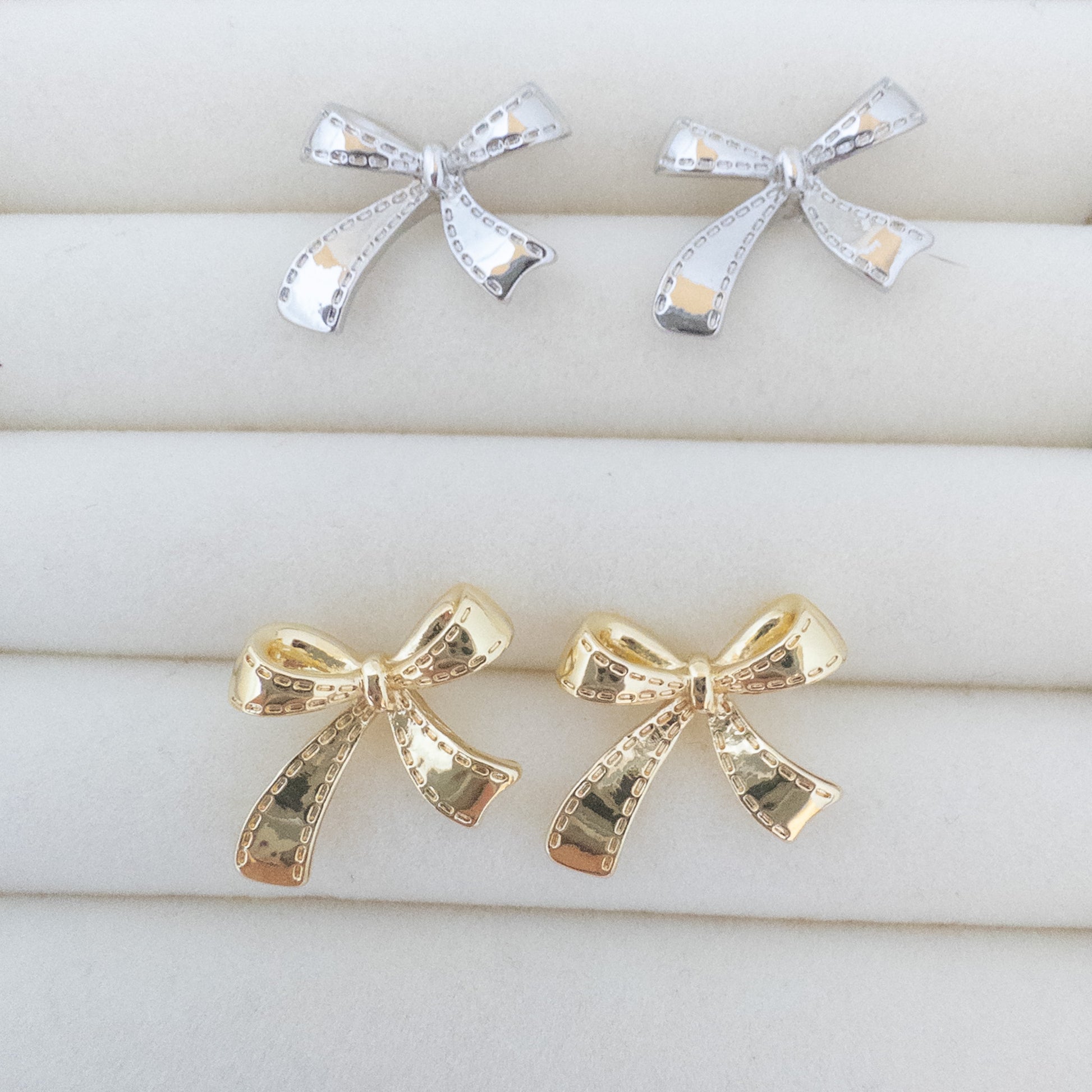Complete your couquette aesthetic look with these adorable bow stud earrings. These earrings feature intricate bow design with a textured ribbon effect.ย Available in silver/gold plated metal, these feminine earrings are perfect for your everyday wear.