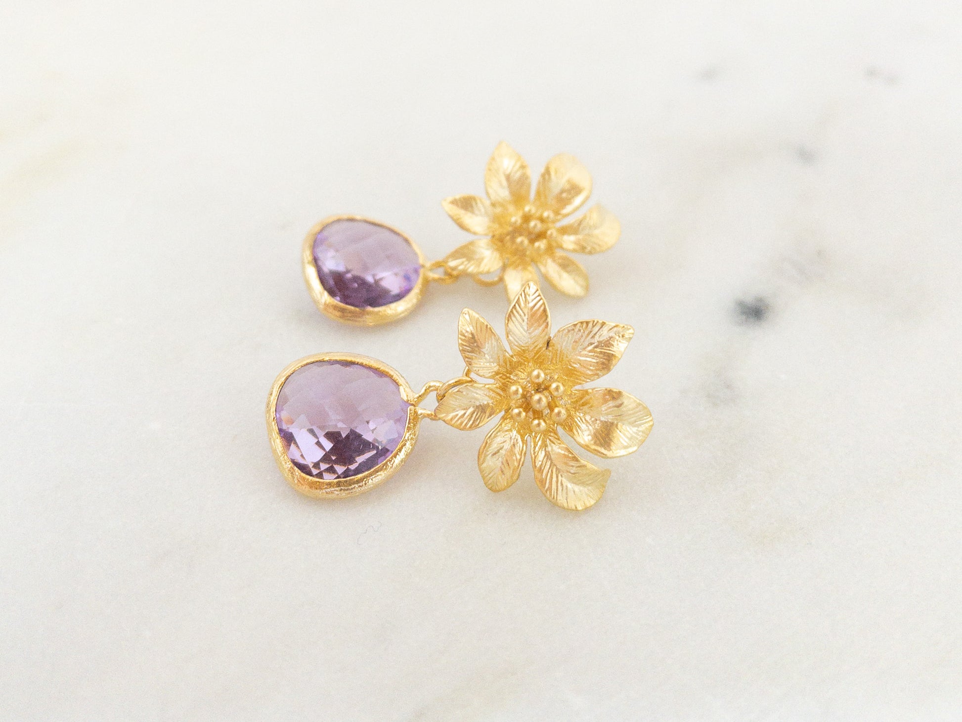 Gold Clematis Flower Earrings with Lilac Stones