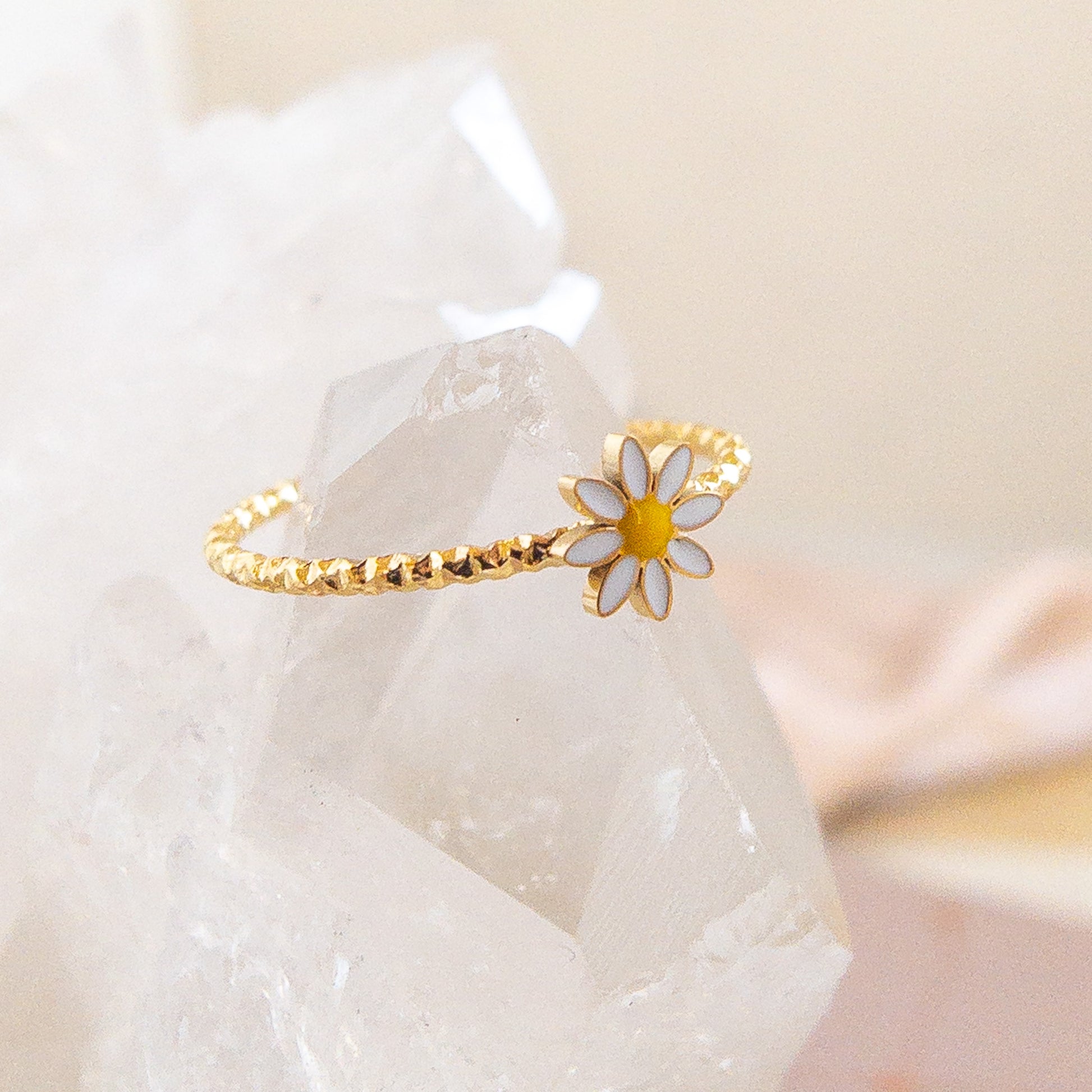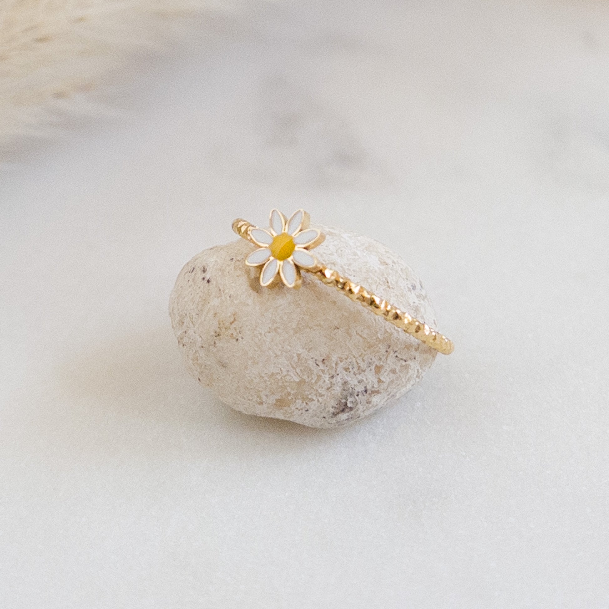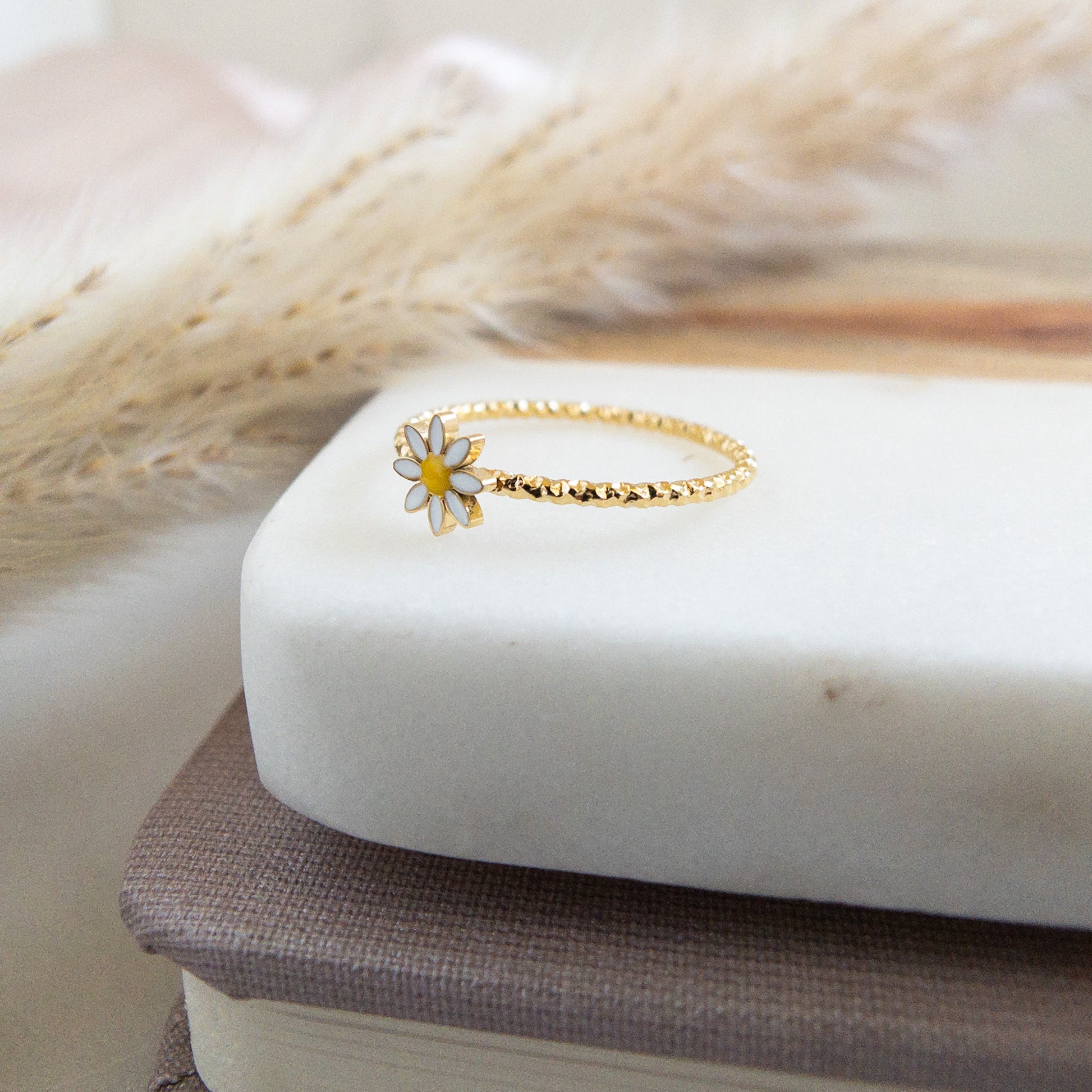 Adorable flower ring with a tiny white daisy and texture band. Wear it by itself for a minimal look or add it to your ring stack for extra texture