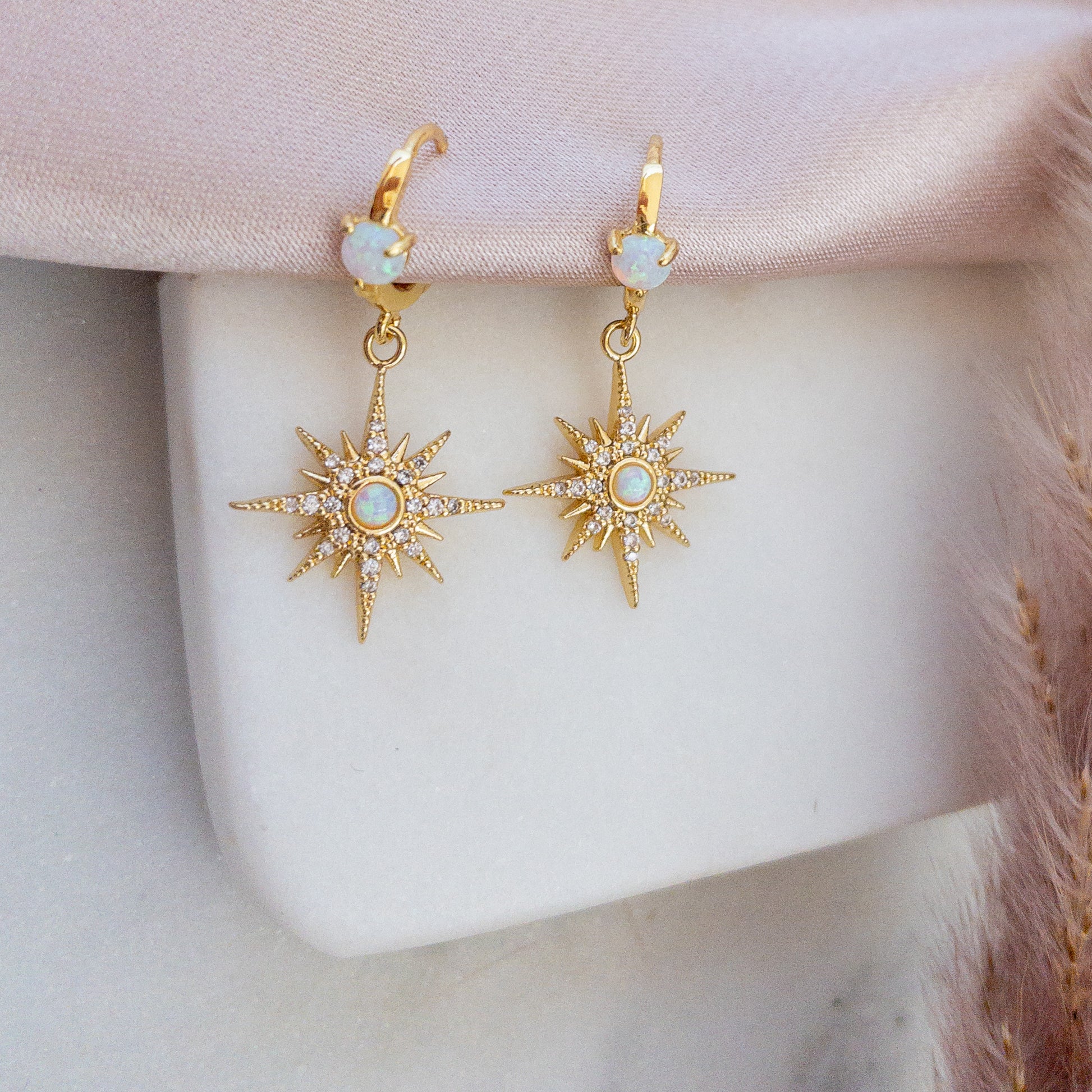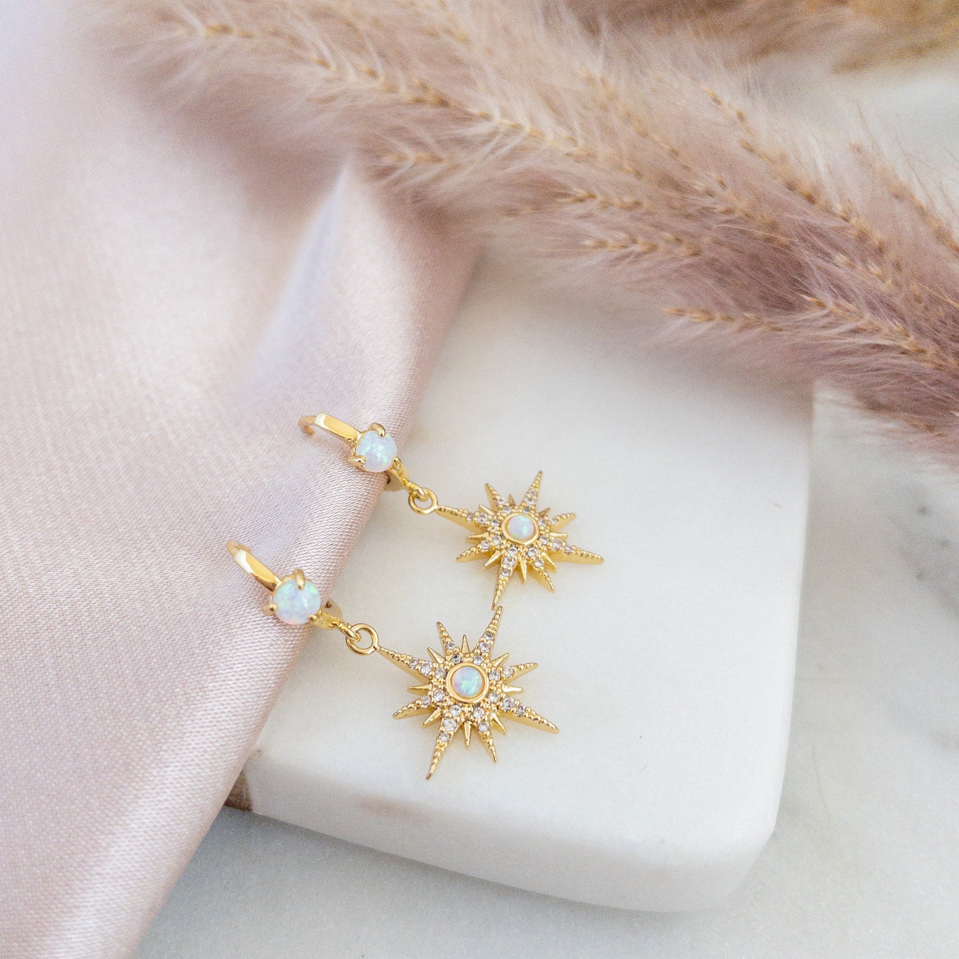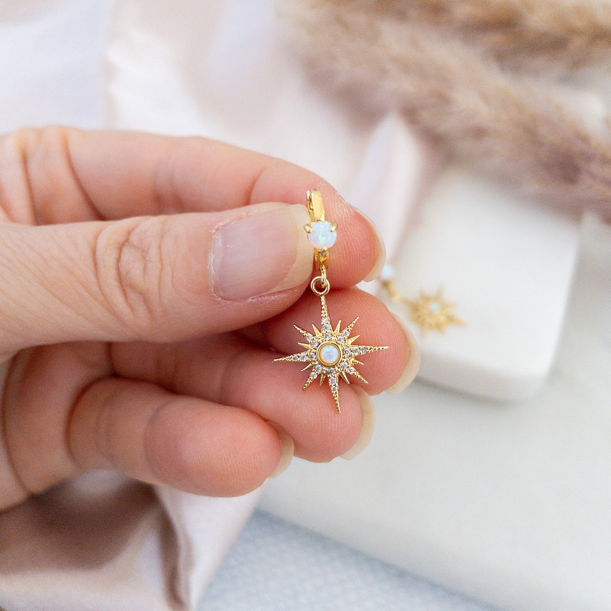 materials : gold plated hoops, starburst charm with opal and cubic zirconia stones