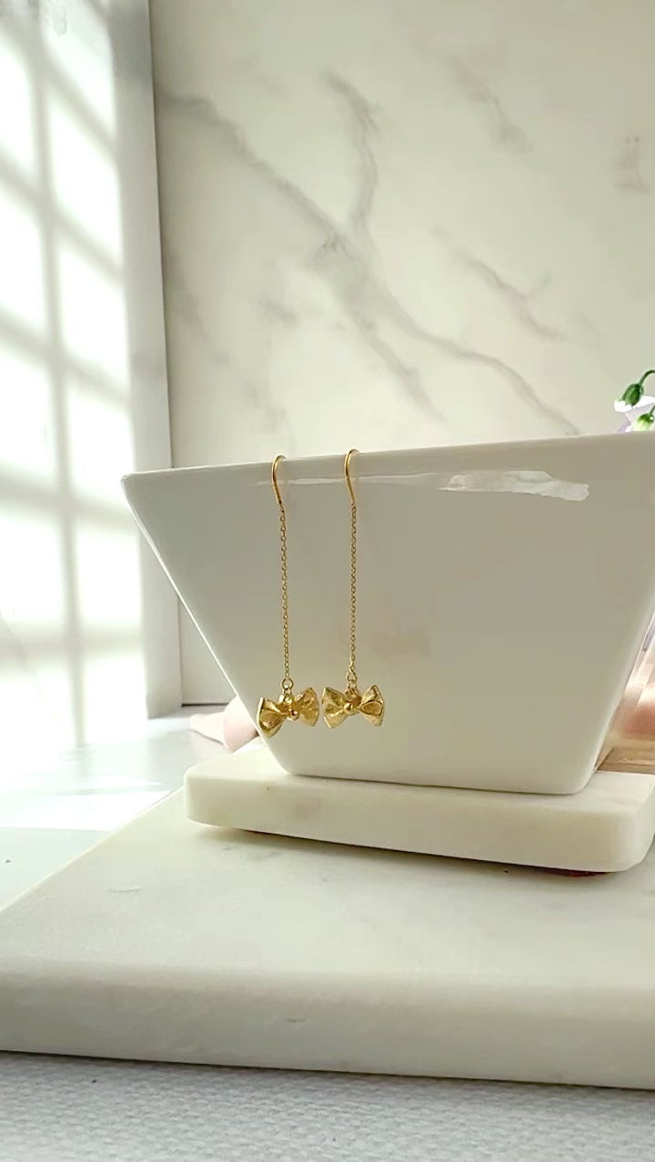 Embrace simplicity with these understated bow earrings, showcasing miniature gold-plated bow charms suspended from elegant gold threader earrings. Crafted with high-quality gold-plated threader chains, these dangling ribbon earrings are both stylish and lightweight, making them an ideal choice for everyday wear. Radiate charm and versatility with these gold ribbon ear threads, making them a perfect gift for teen girls or anyone with an affinity for the timeless elegance of bows