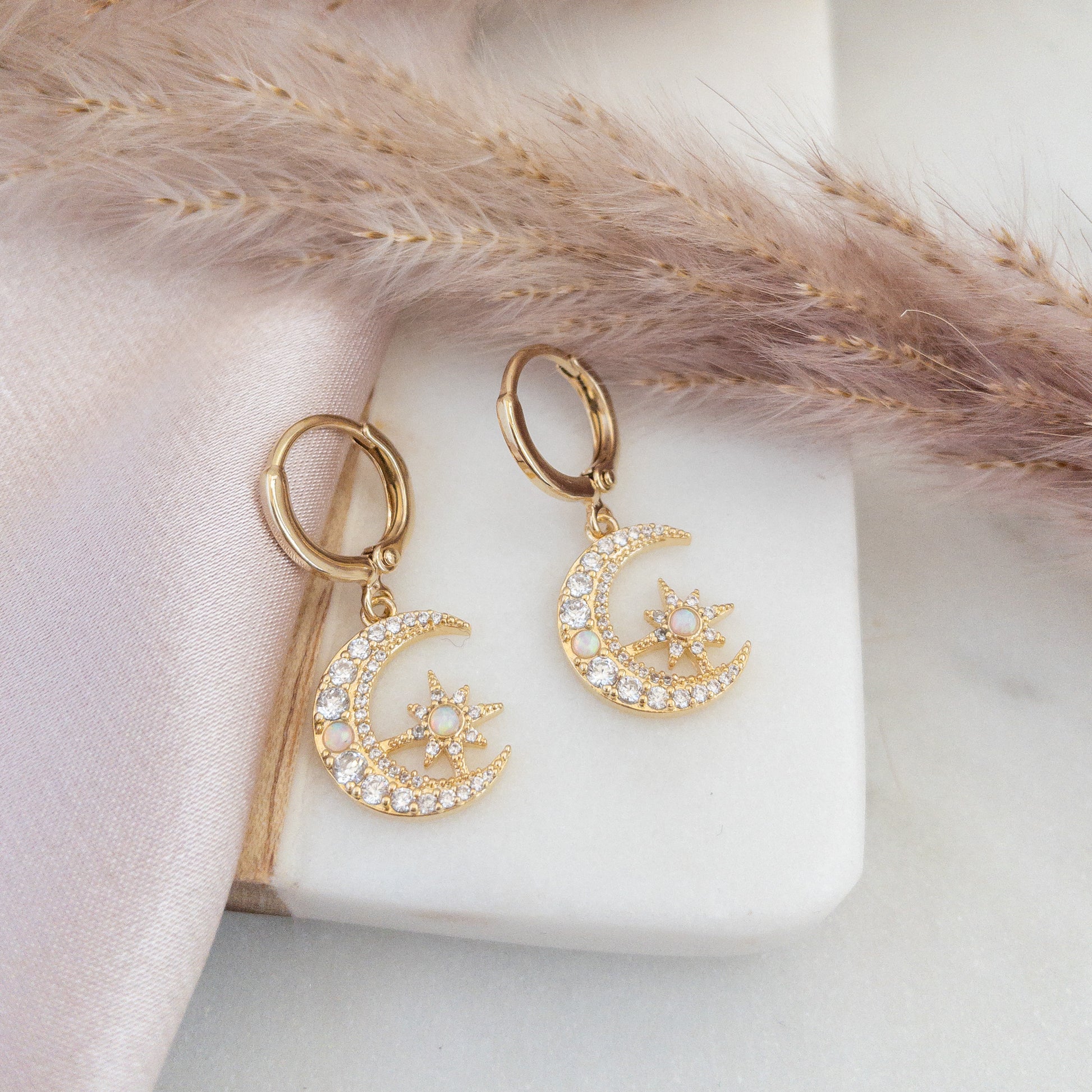 These adorable small hoop earrings features 2 crescent moon and charms studded with sparkly cubic zirconia stones and opal stones. They are suspended on small gold plated 12mm huggie hoops