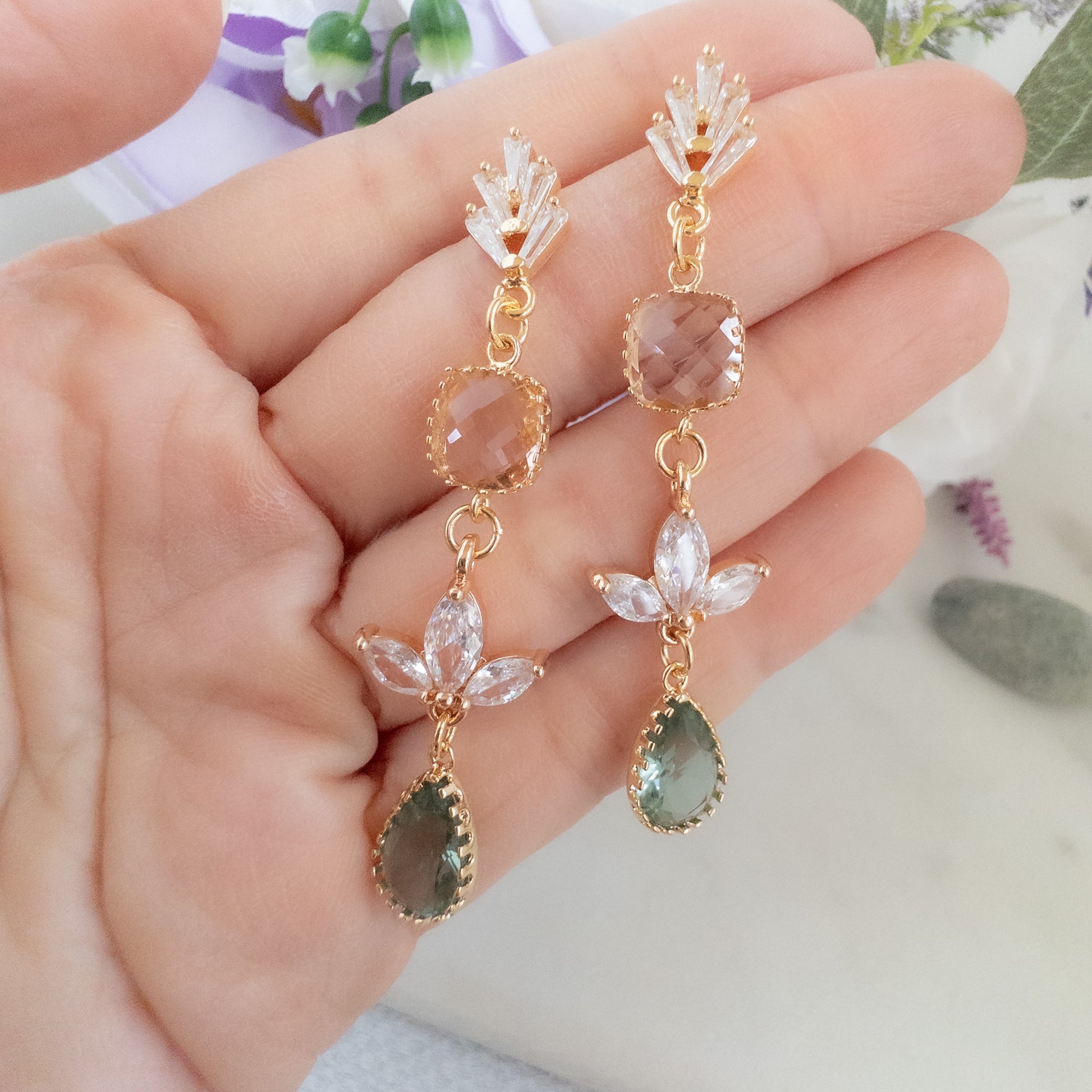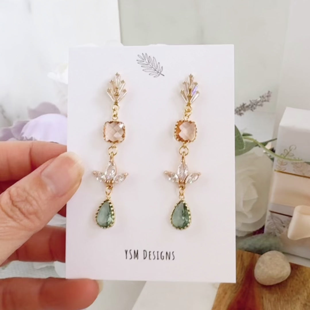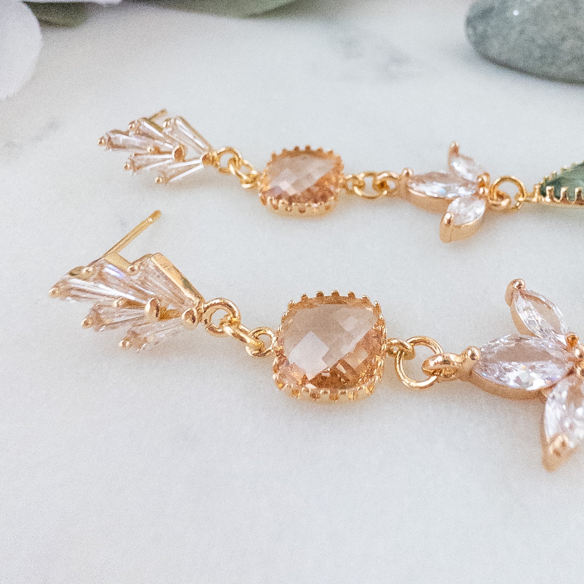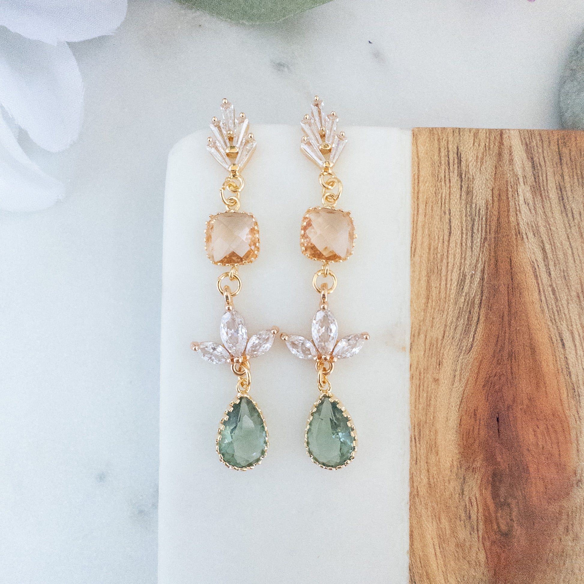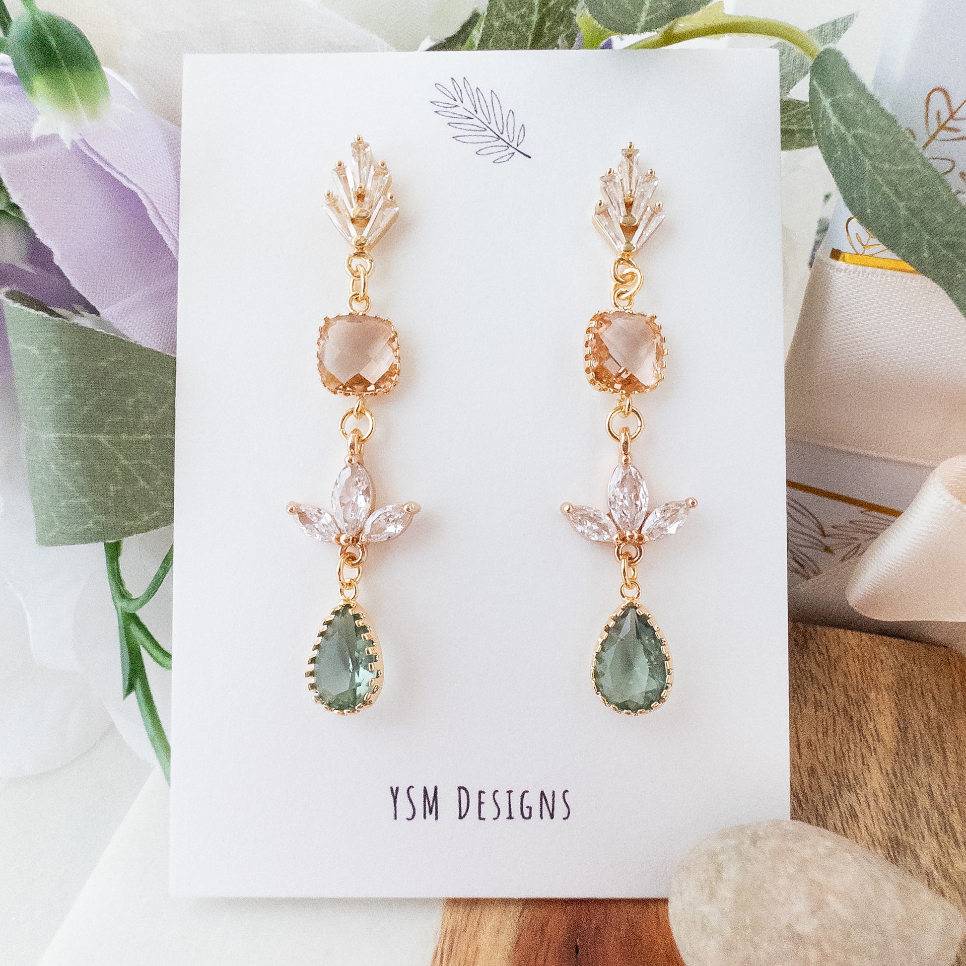 Create a statement with these beautiful art deco style dangle earrings. Featuring a dreamy peach and sage green color combination, these earrings are the perfect finishing touch to your ensemble.