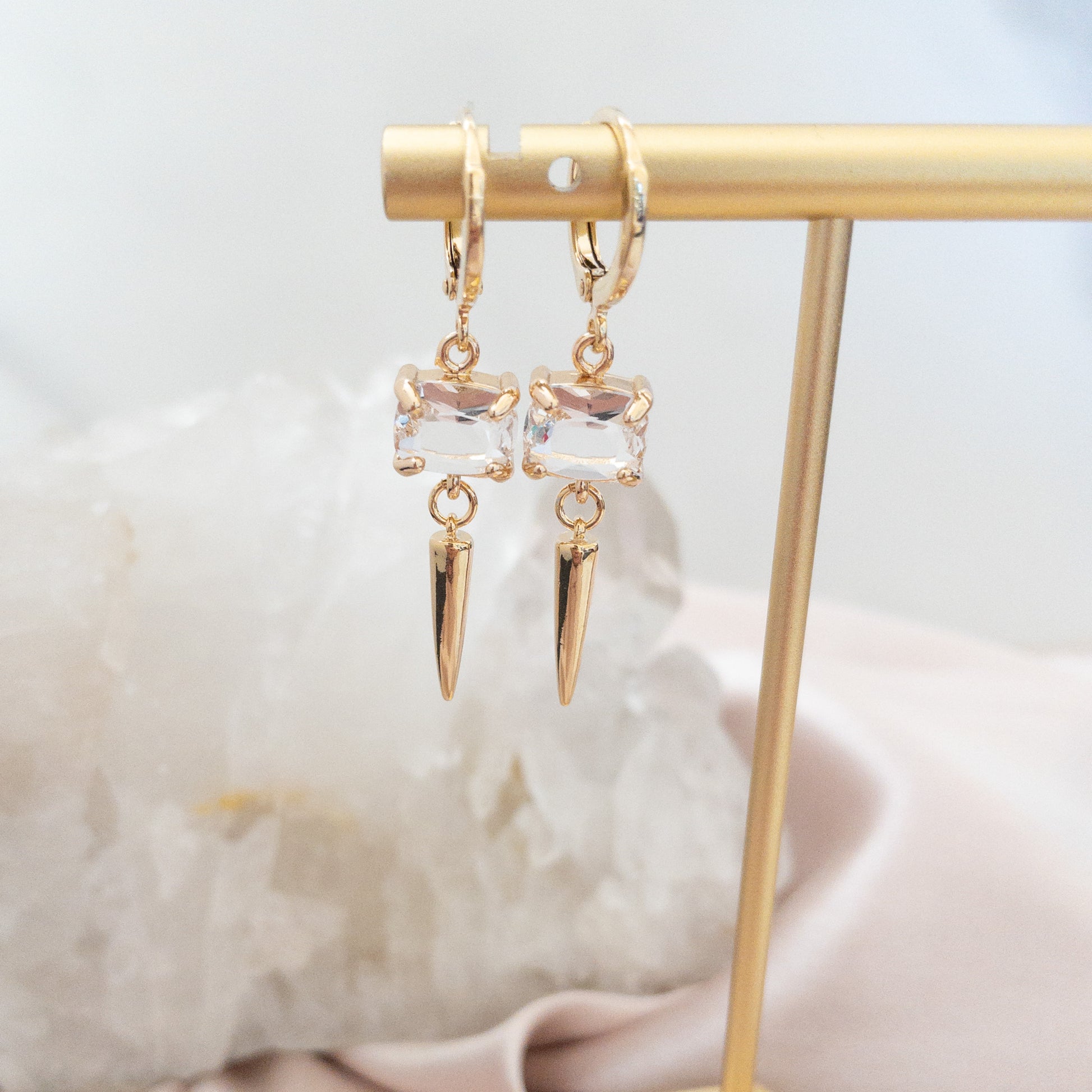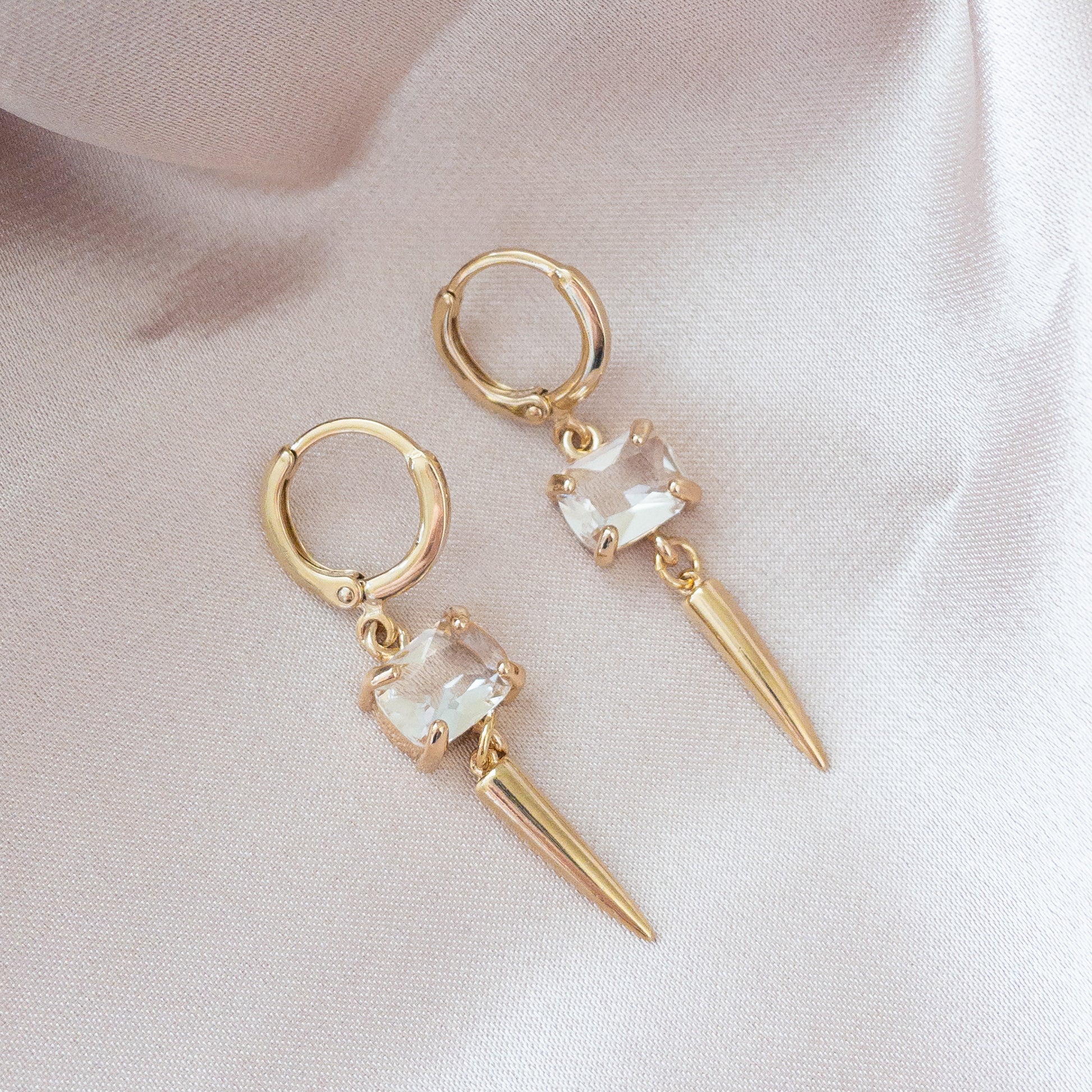 The ivy earrings is a pair small hoop earrings with sparkly rectangular glass crystals with a spike charm at its ends. So chic and edgy.