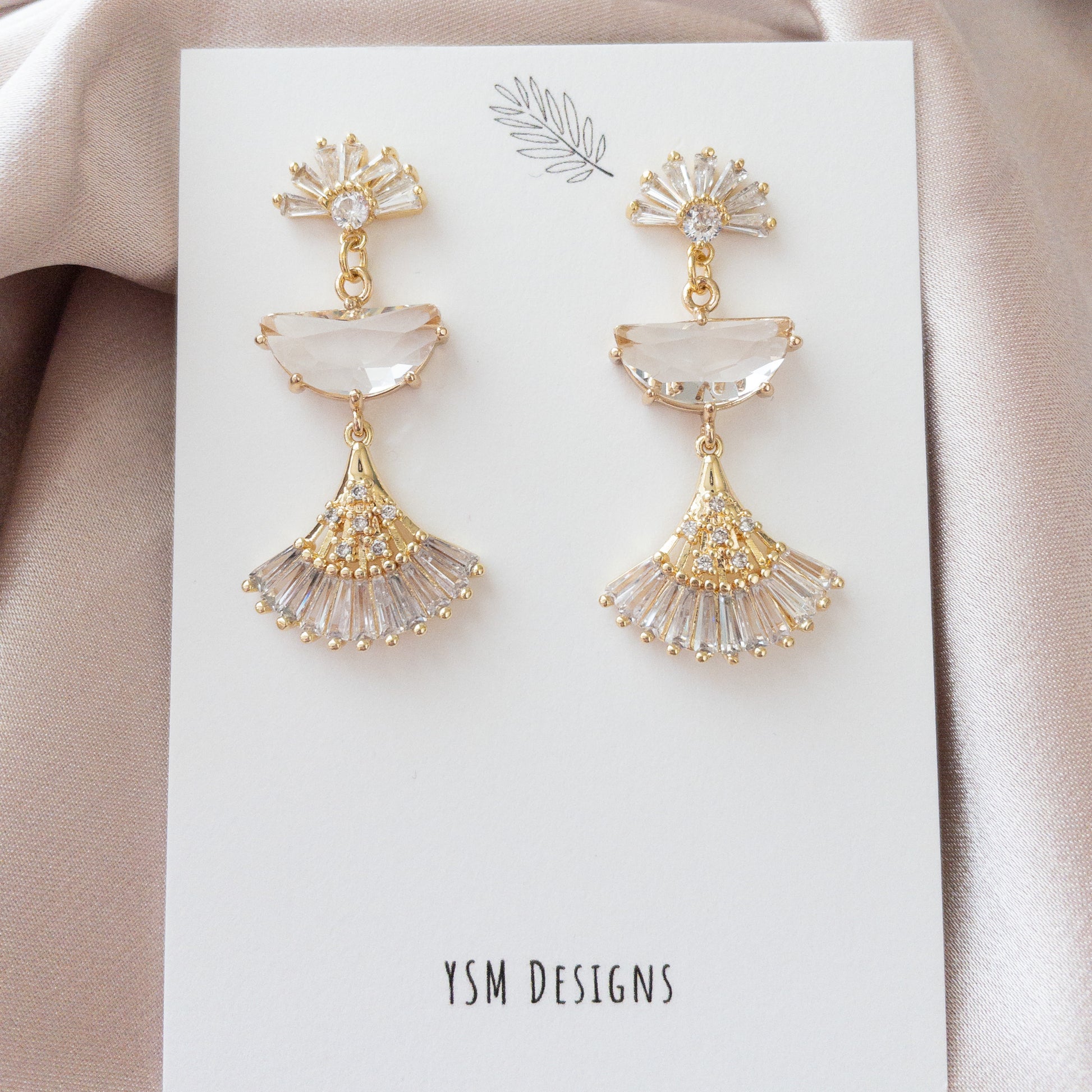 Dress up with these Kinsley earrings. Featuring sparkling fan shaped studs with statement making fan charms.