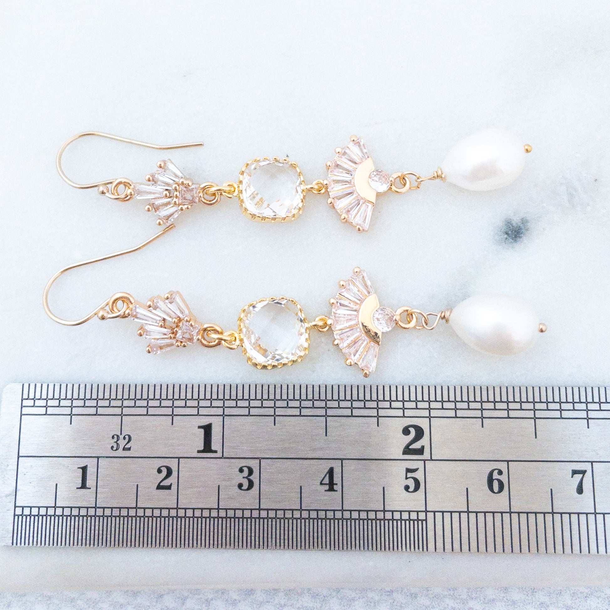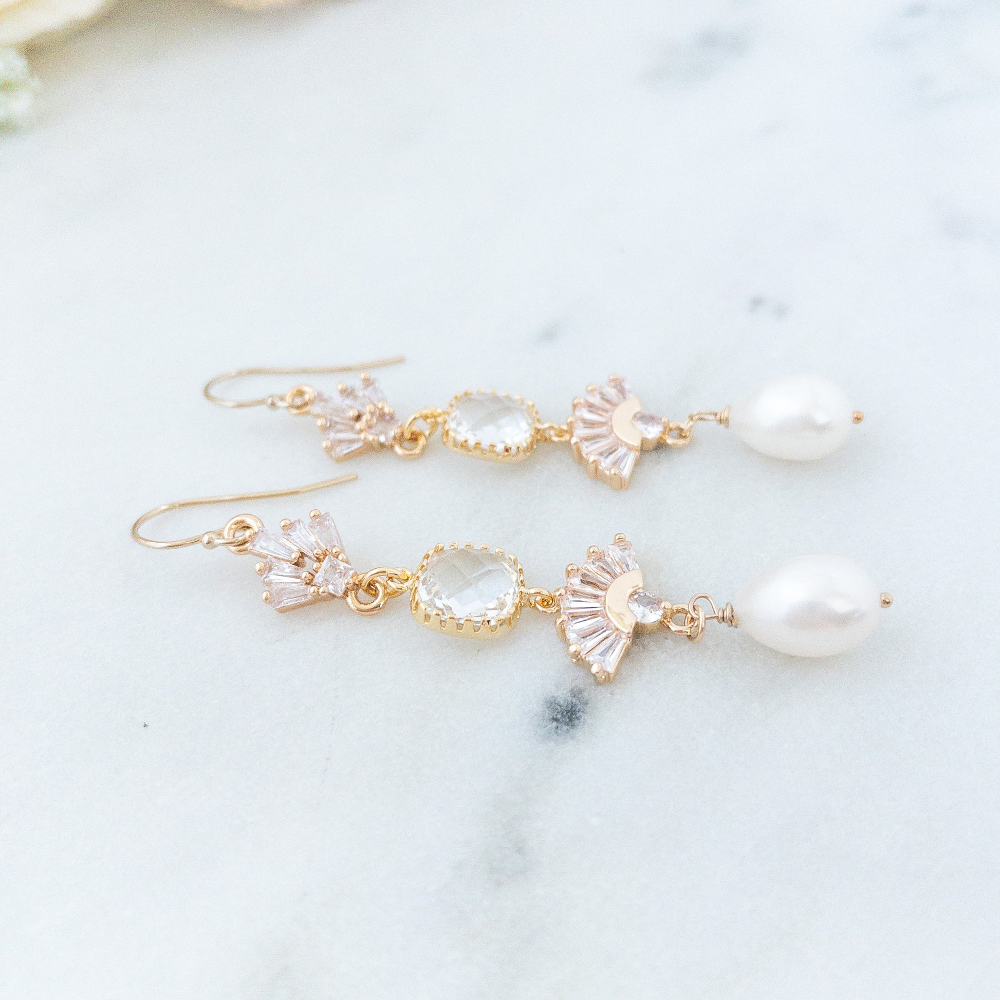 Introducing our stunning gold drop earrings, influenced by the timeless allure of Art Deco and vintage design. These earrings showcase captivating glass crystal fan shapes and delicate pearl drops at the ends, creating a refined and sophisticated aesthetic. Ideal for brides seeking a touch of charm and sophistication on their special day, these earrings seamlessly blend classic and contemporary styles. Elevate your bridal ensemble with the alluring design of these meticulously crafted gold drop earrings.