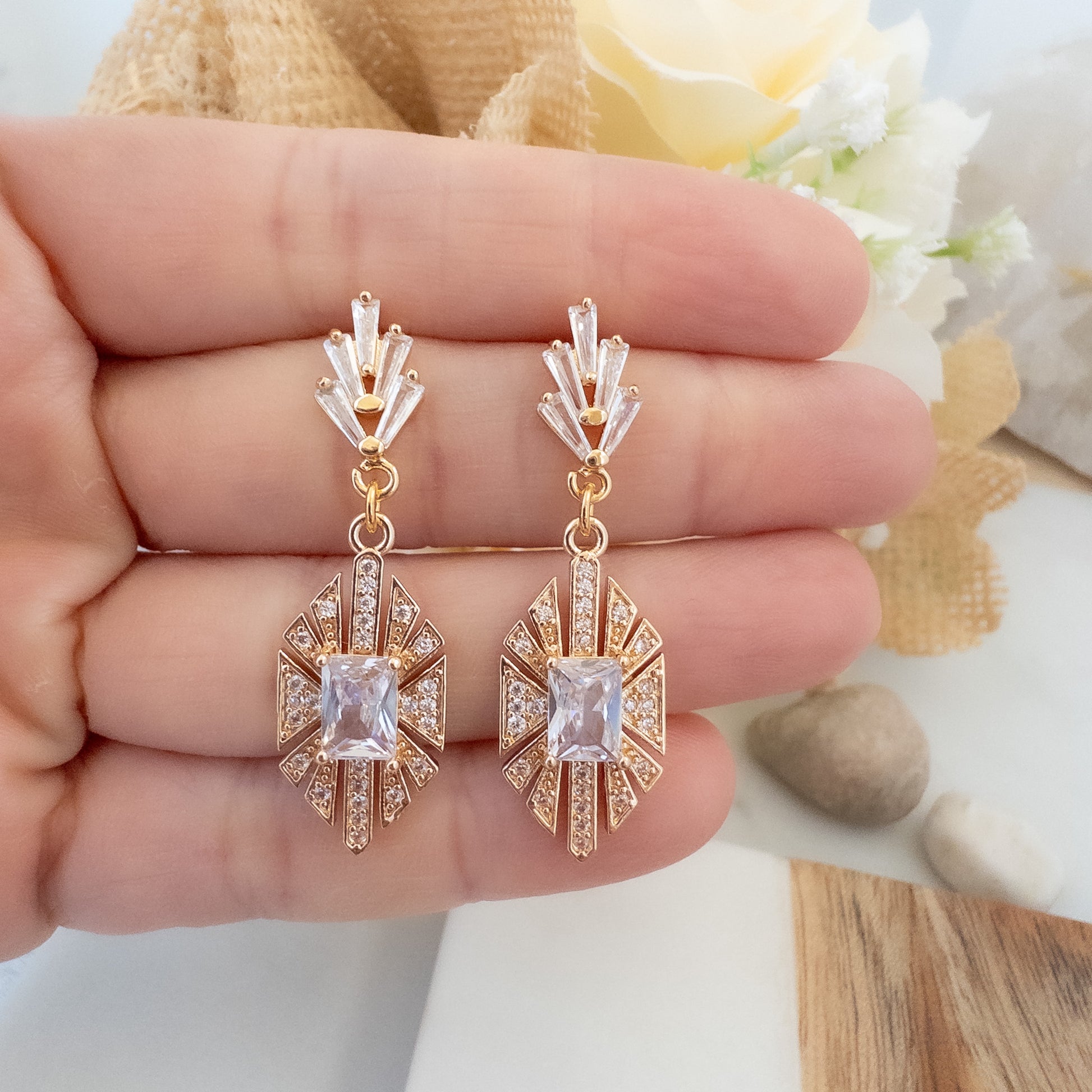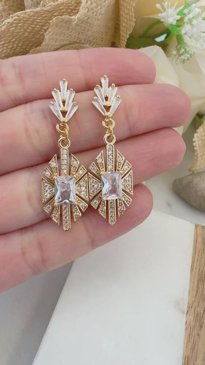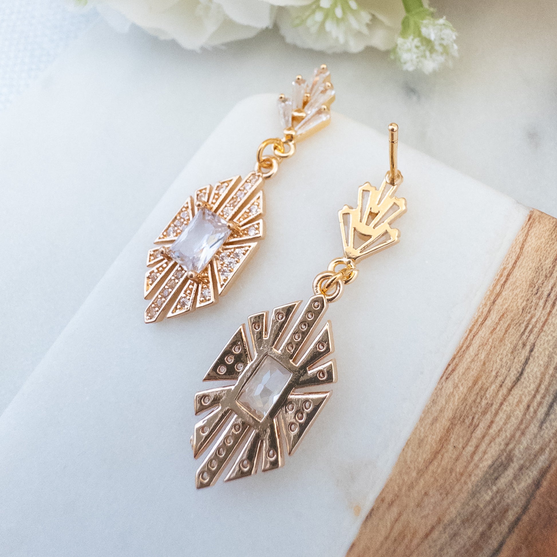 Embrace the retro charm with our Vintage Style Odessa Earrings, featuring gold art deco designs and dazzling crystal dangles for a touch of old-world glamour. These geometric earrings are perfect for special occasions like a Gatsby gala or your retro wedding event, adding a unique and vintage flair to your ensemble.