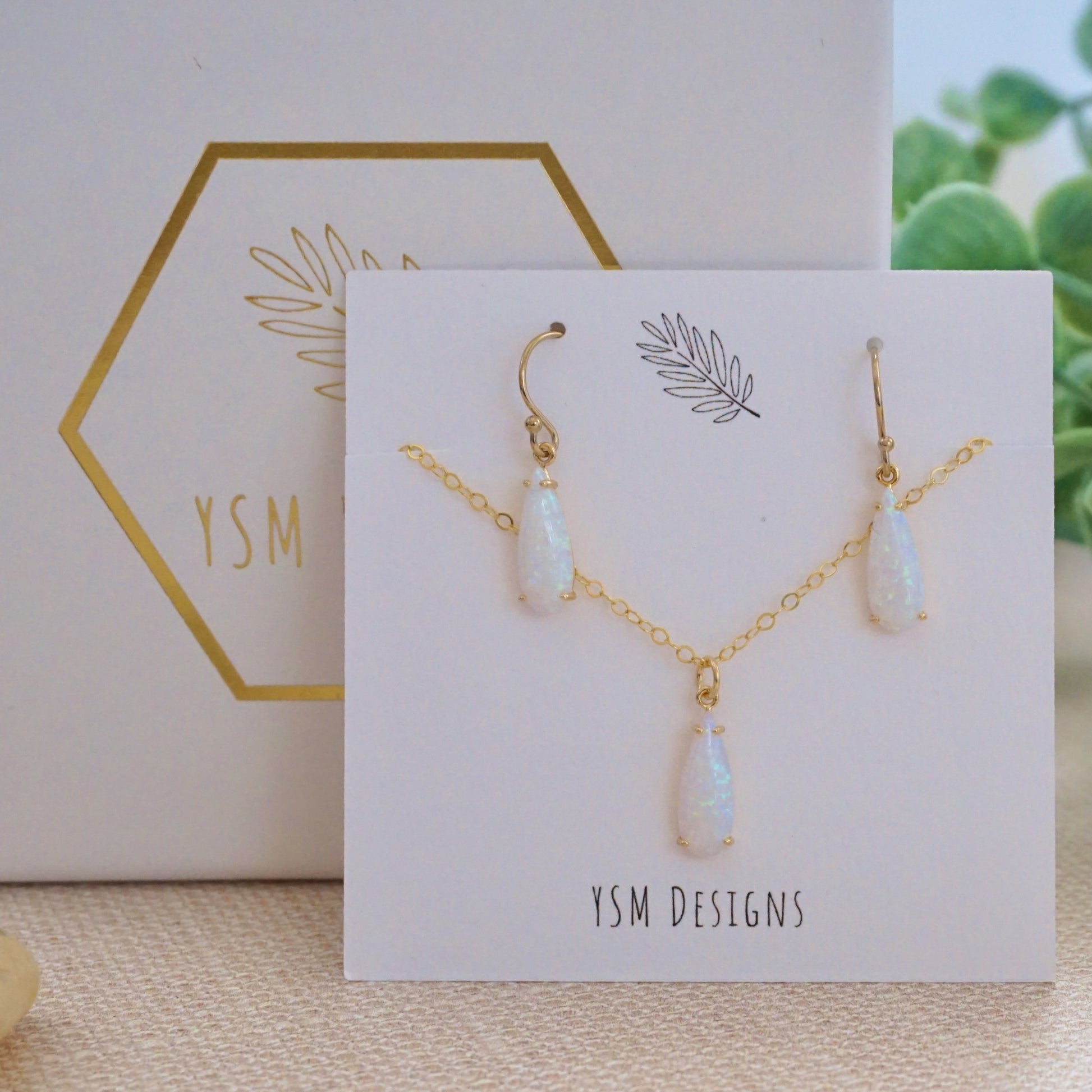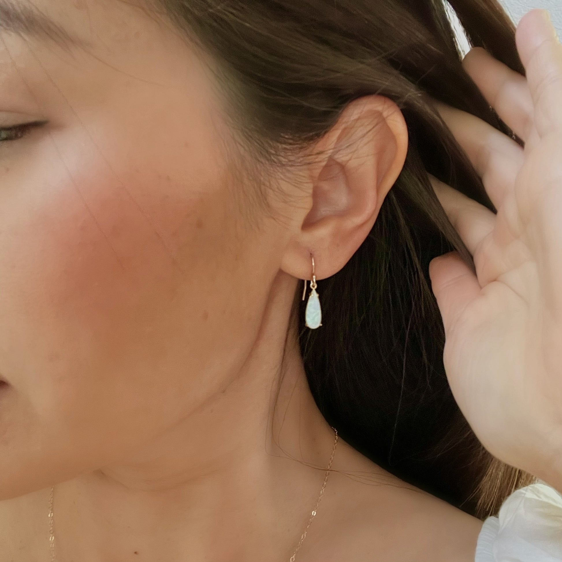 These dainty opal earrings showcase a iridescent teardrop shaped opalite stones on 14K gold filled ear wires. Simple yet eye-catching, they make a beautiful gift for jewelry lover, with their soft shimmer and minimal design. Matching necklace features the same opal pendant suspended on a 14K gold filled chain. Purchase them separately or together as a set and get an extra 10% off your purchase.