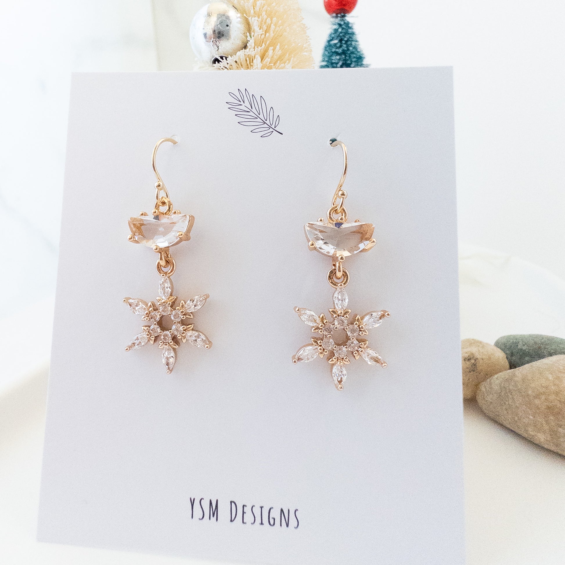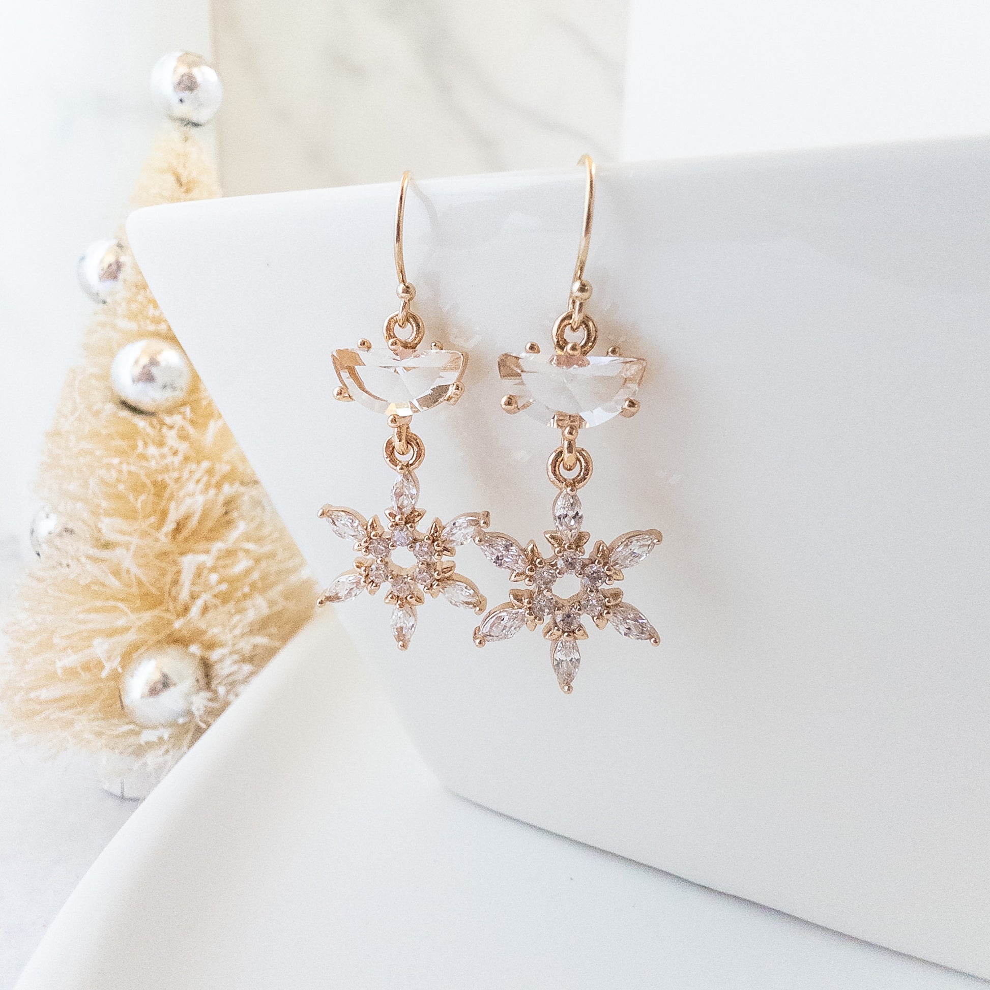 These delicate snowflake dangle earrings feature shimmering half-moon glass crystals with rhinestone snowflake charm dangles, adding a festive sparkle to your holiday style. Packaged in a beautiful gold foil gift box, they’re ready to delight as a thoughtful Christmas gift. Perfectly dainty and full of holiday charm, these earrings make an elegant addition to any winter wardrobe.