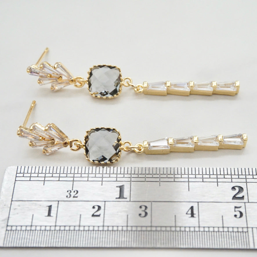 Dazzle at your wedding formal event or any party with these stunning 1920s inspired statement earrings. Glittering crystals and a gray stone create the perfect balance of sparkle and sophistication for your special occasion.