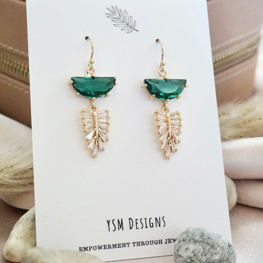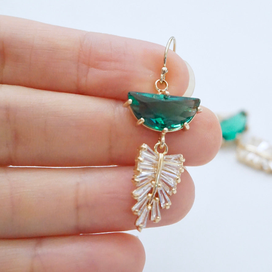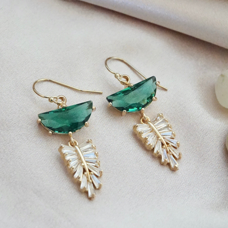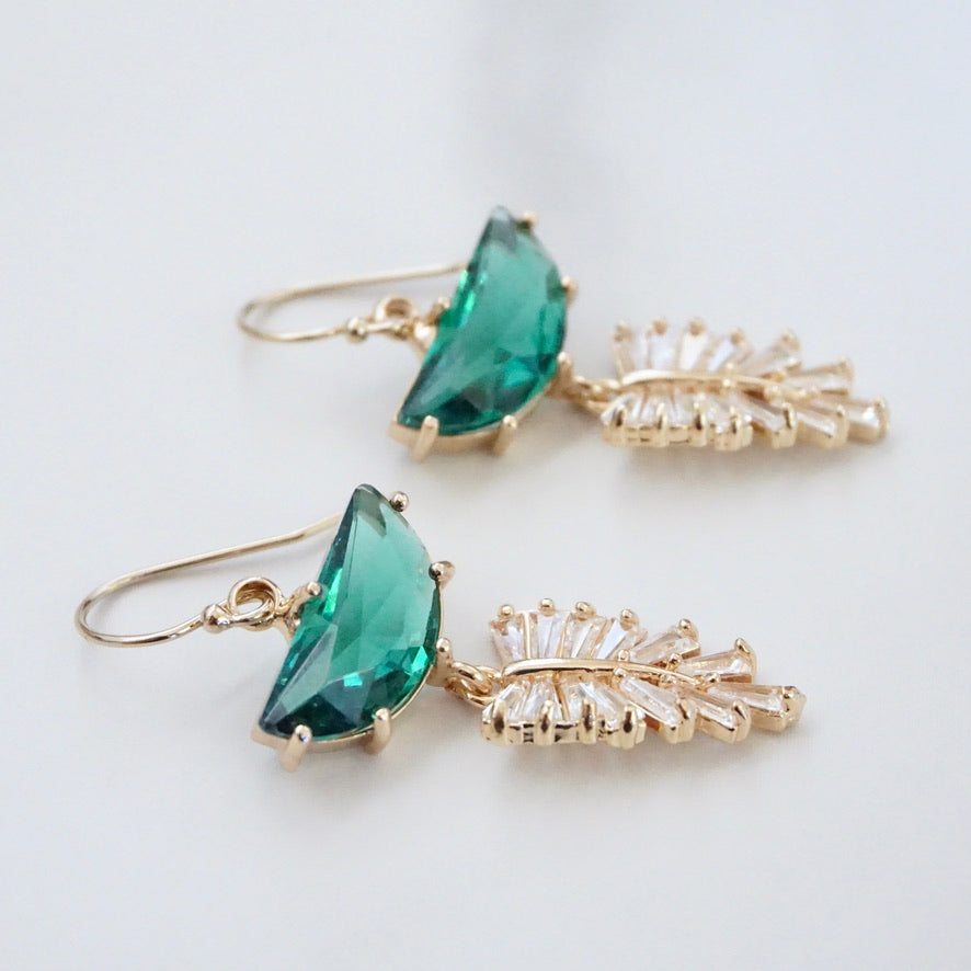 Beautiful 1920s inspired art deco earrings. These vintage style earrings feature emerald green half moon crystals with sparkly leaf shaped crystal at its ends. You will feel like a green goddess wearing these.