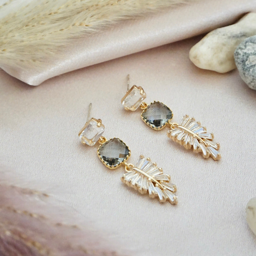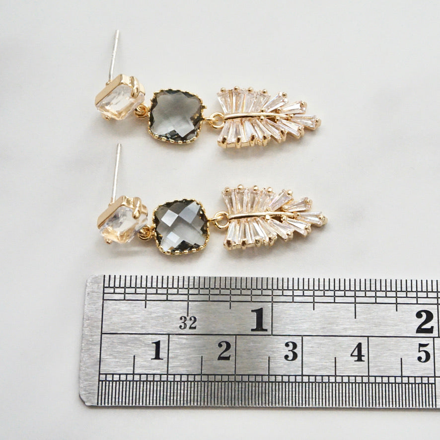 If you are looking to add some sparkle to your outfit, these Art Deco leaf earrings will surely fit the bill. These earrings feature leaf shaped glass crystals connected with grey crystal accent, and finished with a rectangular push back posts.