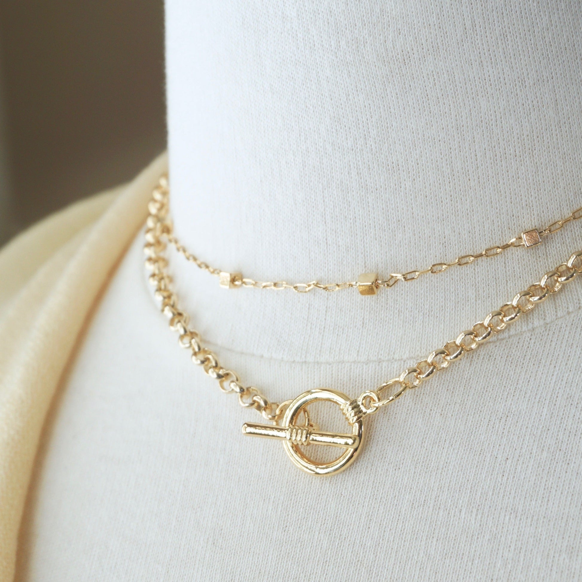 - gold plated round link chain finished with a toggle clasp